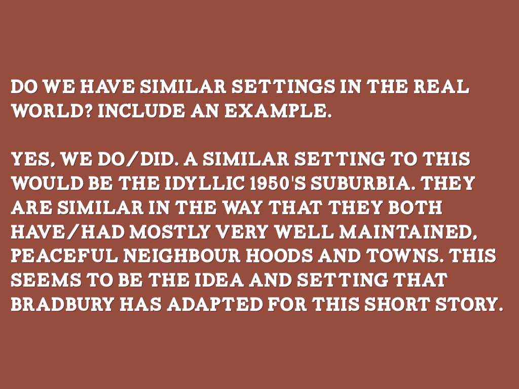 Yes, we do/did. A similar setting to this would be the idyllic 1950's suburbia. They are similar in the way that they both have/had mostly very well maintained, peaceful neighbour hoods and towns. This seems to be the idea and setting that Bradbury has adapted for this short story.
