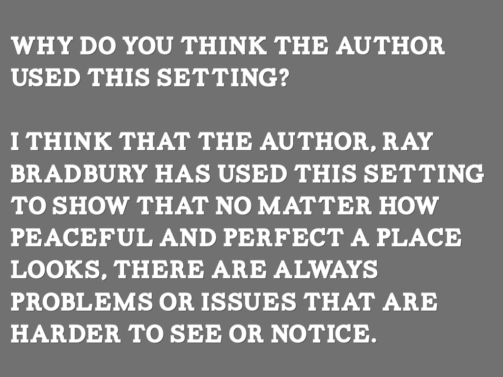 I think that the author, Ray Bradbury has used this setting to show that no matter how peaceful and perfect a place looks, there are always problems or issues that are harder to see or notice.