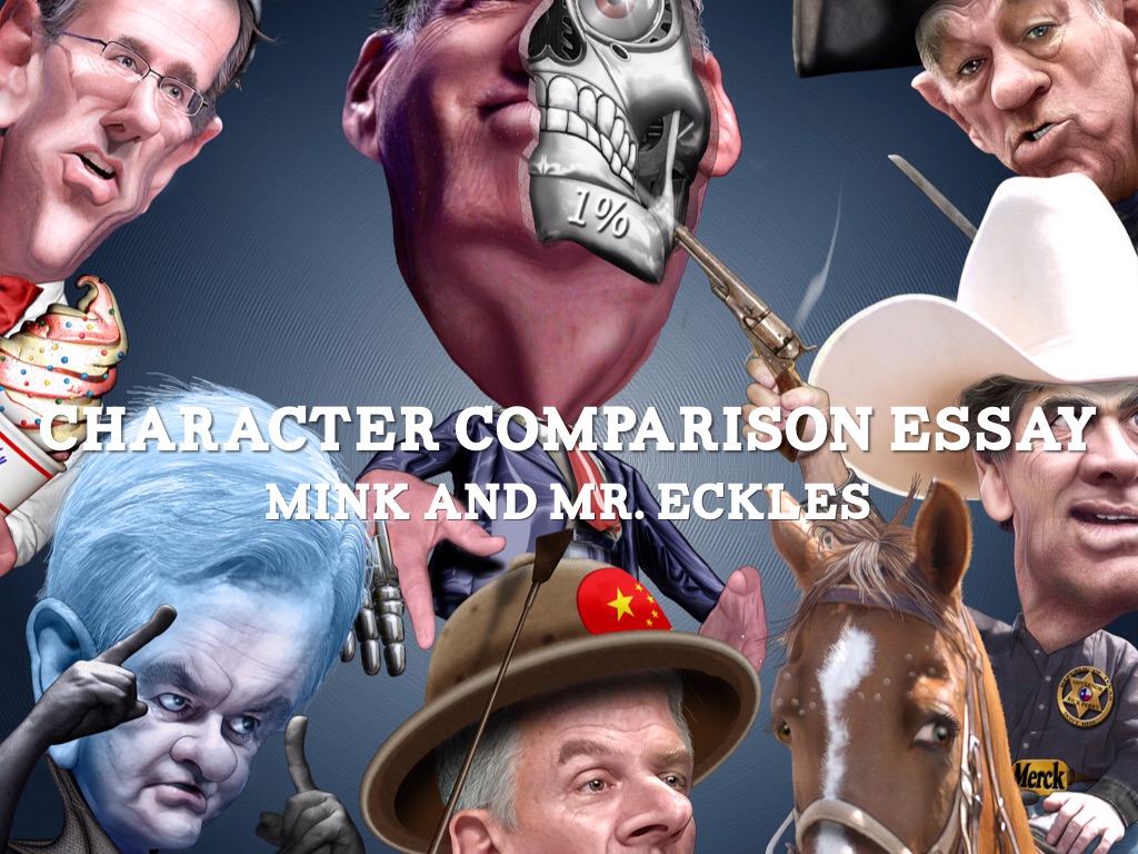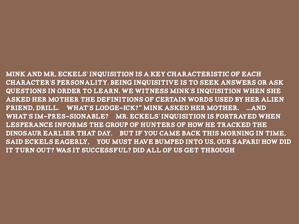 Mink and Mr, Eckels' inquisition is a key characteristic of each character's personality. Being inquisitive is to seek answers or ask questions in order to learn. We witness mink's inquisition when she asked her mother the definitions of certain words used by her alien friend, Drill. "What's lodge-ick?” Mink asked her mother. "...And what's im-pres-sionable?" Mr. Eckels' inquisition is portrayed when Lesperance informs the group of hunters of how he tracked the dinosaur earlier that day. "But if you came back this morning in Time," said Eckels eagerly, "you must have bumped into us, our safari! How did it turn out? Was it successful? Did all of us get through