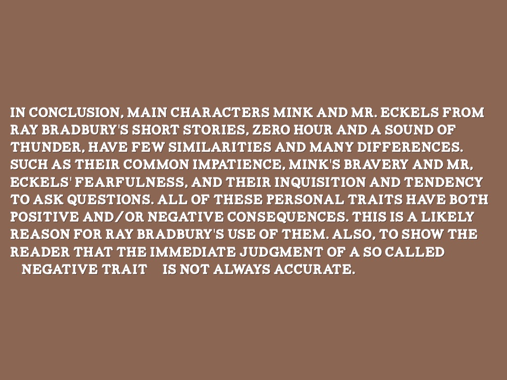 In conclusion, main characters Mink and Mr. Eckels from Ray Bradbury's short stories, Zero Hour and A sound of Thunder, have few similarities and many differences. Such as their common impatience, mink's bravery and mr, Eckels' fearfulness, and their inquisition and tendency to ask questions. All of these personal traits have both positive and/or negative consequences. This is a likely reason for Ray Bradbury's use of them. Also, to show the reader that the immediate judgment of a so called "negative trait" is not always accurate.
