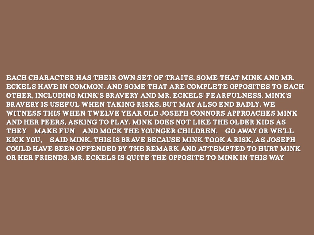Each character has their own set of traits. Some that mink and Mr. Eckels have in common, and some that are complete opposites to each other, including Mink's bravery and Mr. Eckels' fearfulness. Mink's bravery is useful when taking risks, but may also end badly. We witness this when twelve year old Joseph Connors approaches mink and her peers, asking to play. Mink does not like the older kids as they "make fun" and mock the younger children. "Go away or we'll kick you," said Mink. This is brave because Mink took a risk, as Joseph could have been offended by the remark and attempted to hurt Mink or her friends. Mr. Eckels is quite the opposite to mink in this way