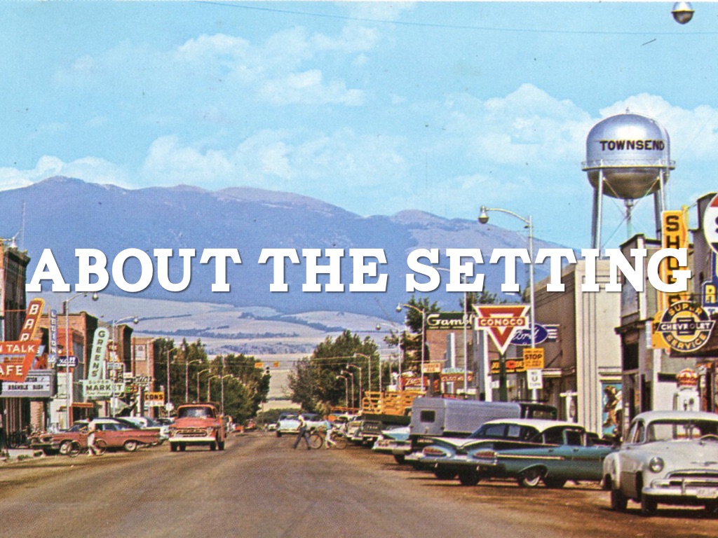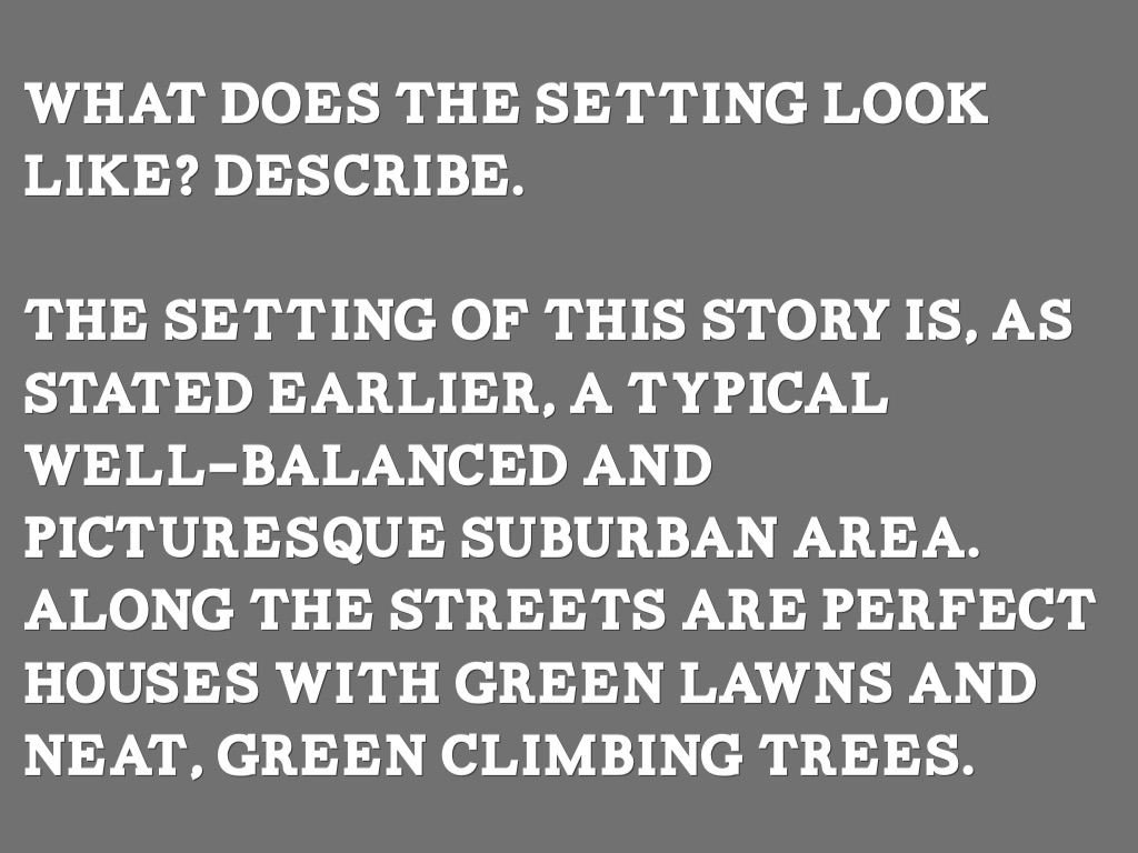 The setting of this story is, as stated earlier, a typical well-balanced and picturesque suburban area. Along the streets are perfect houses with green lawns and neat, green climbing trees.