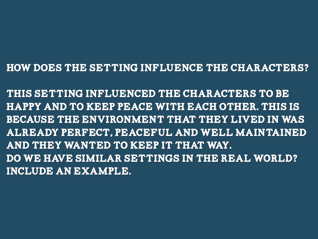 This setting influenced the characters to be happy and to keep peace with each other. This is because the environment that they lived in was already perfect, peaceful and well maintained and they wanted to keep it that way.