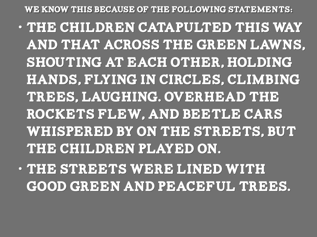 - The children catapulted this way and that across the green lawns, shouting at each other, holding hands, flying in circles, climbing trees, laughing. Overhead the rockets flew, and beetle cars whispered by on the streets, but the children played on."