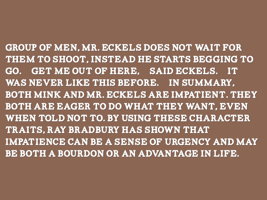 group of men, Mr. Eckels does not wait for them to shoot, instead he starts begging to go. "Get me out of here," said Eckels. "It was never like this before." In summary, both Mink and Mr. Eckels are impatient. They both are eager to do what they want, even when told not to. By using these character traits, Ray Bradbury has shown that impatience can be a sense of urgency and may be both a bourdon or an advantage in life.