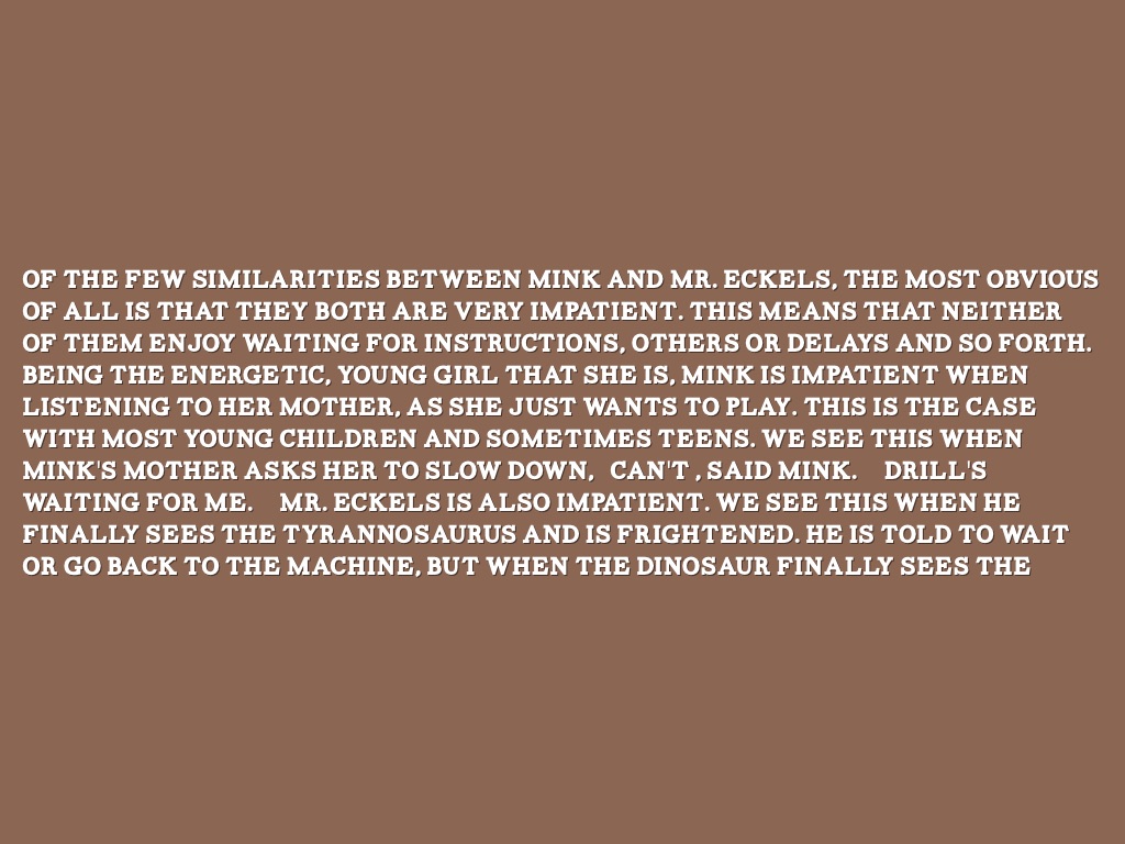Of the few similarities between Mink and Mr. Eckels, the most obvious of all is that they both are very impatient. This means that neither of them enjoy waiting for instructions, others or delays and so forth. Being the energetic, young girl that she is, Mink is impatient when listening to her mother, as she just wants to play. This is the case with most young children and sometimes teens. We see this when Mink's mother asks her to slow down, can't , said Mink. "Drill's waiting for me." Mr. Eckels is also impatient. We see this when he finally sees the Tyrannosaurus and is frightened. He is told to wait or go back to the machine, but when the dinosaur finally sees the