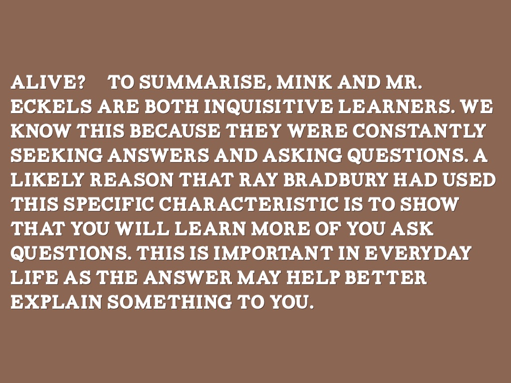 alive?" To summarise, mink and Mr. Eckels are both inquisitive learners. We know this because they were constantly seeking answers and asking questions. A likely reason that Ray Bradbury had used this specific characteristic is to show that you will learn more of you ask questions. This is important in everyday life as the answer may help better explain something to you.