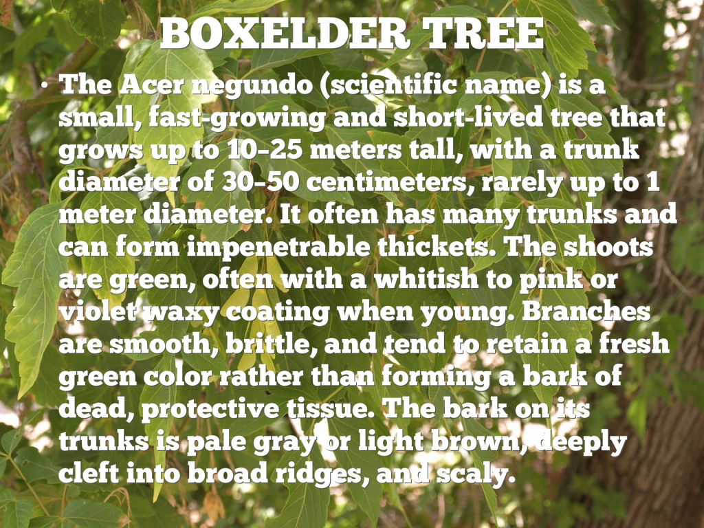 The Acer negundo (scientific name) is a small, fast-growing and short-lived tree that grows up to 10–25 meters tall, with a trunk diameter of 30–50 centimeters, rarely up to 1 meter diameter. It often has many trunks and can form impenetrable thickets. The shoots are green, often with a whitish to pink or violet waxy coating when young. Branches are smooth, brittle, and tend to retain a fresh green color rather than forming a bark of dead, protective tissue. The bark on its trunks is pale gray or light brown, deeply cleft into broad ridges, and scaly.
