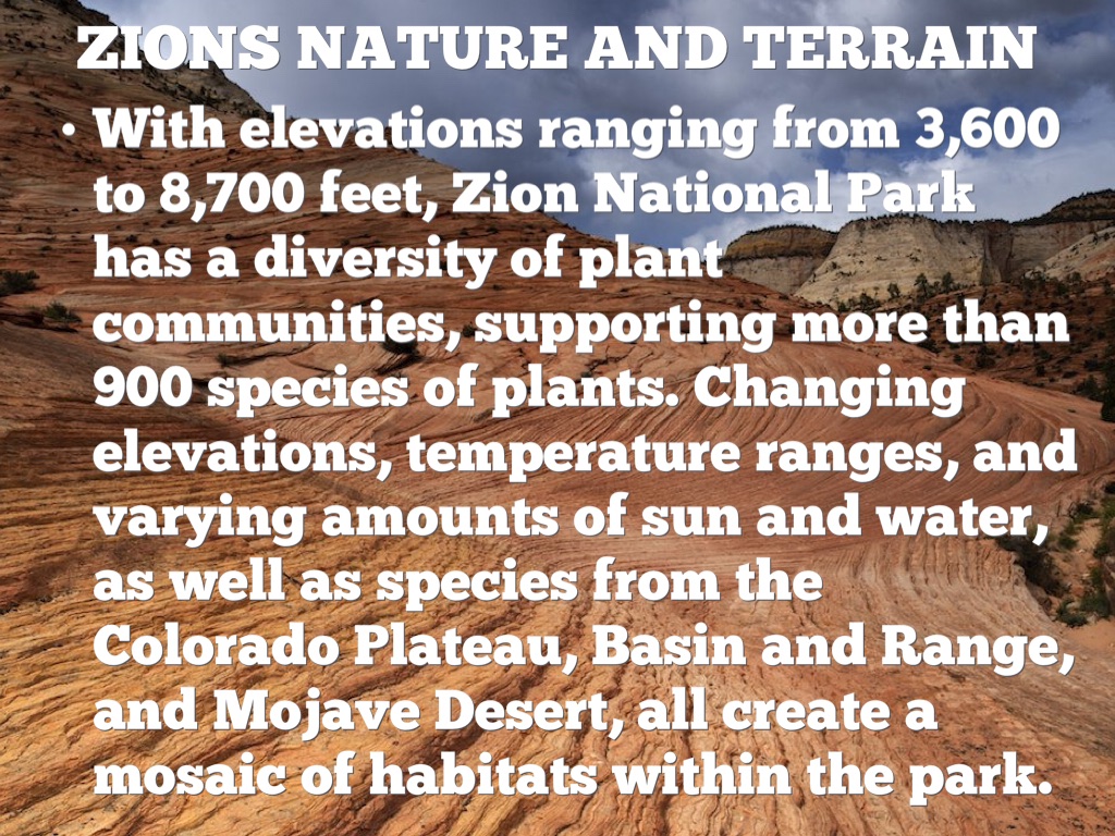 With elevations ranging from 3,600 to 8,700 feet, Zion National Park has a diversity of plant communities, supporting more than 900 species of plants. Changing elevations, temperature ranges, and varying amounts of sun and water, as well as species from the Colorado Plateau, Basin and Range, and Mojave Desert, all create a mosaic of habitats within the park.