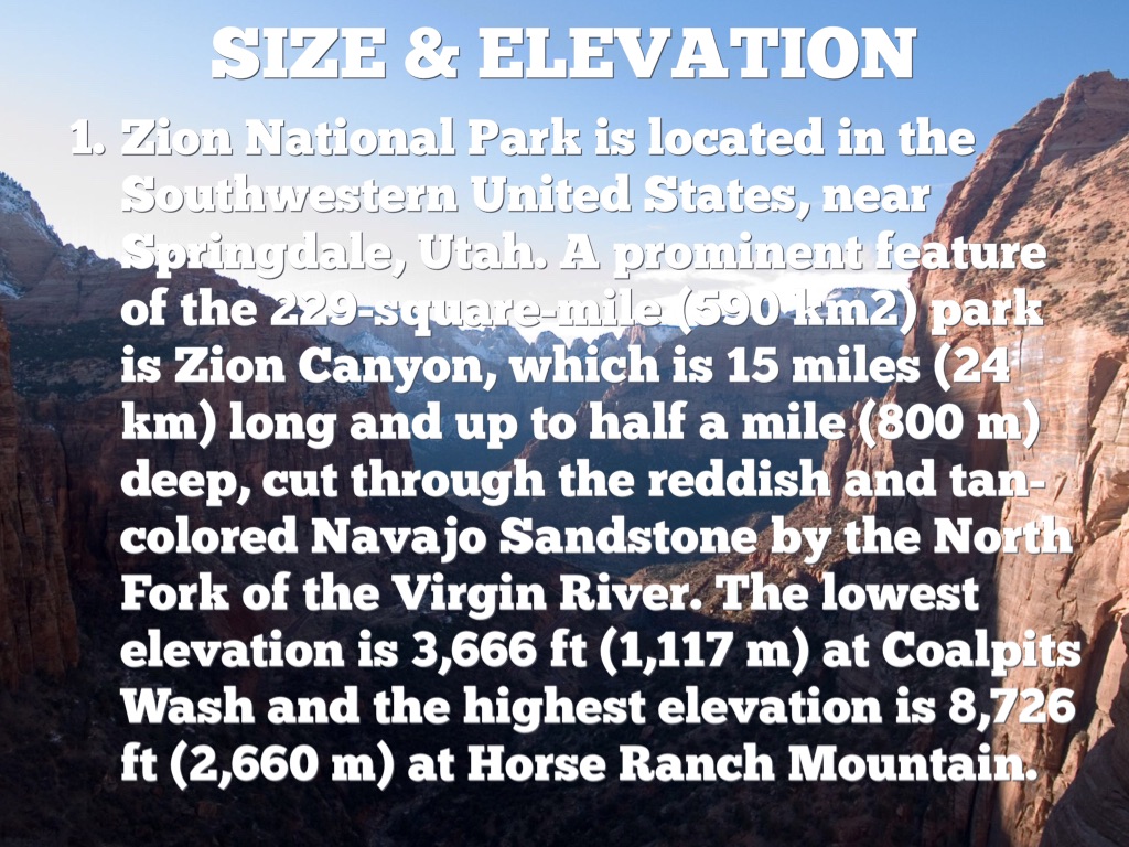 Zion National Park is located in the Southwestern United States, near Springdale, Utah. A prominent feature of the 229-square-mile (590 km2) park is Zion Canyon, which is 15 miles (24 km) long and up to half a mile (800 m) deep, cut through the reddish and tan-colored Navajo Sandstone by the North Fork of the Virgin River. The lowest elevation is 3,666 ft (1,117 m) at Coalpits Wash and the highest elevation is 8,726 ft (2,660 m) at Horse Ranch Mountain.