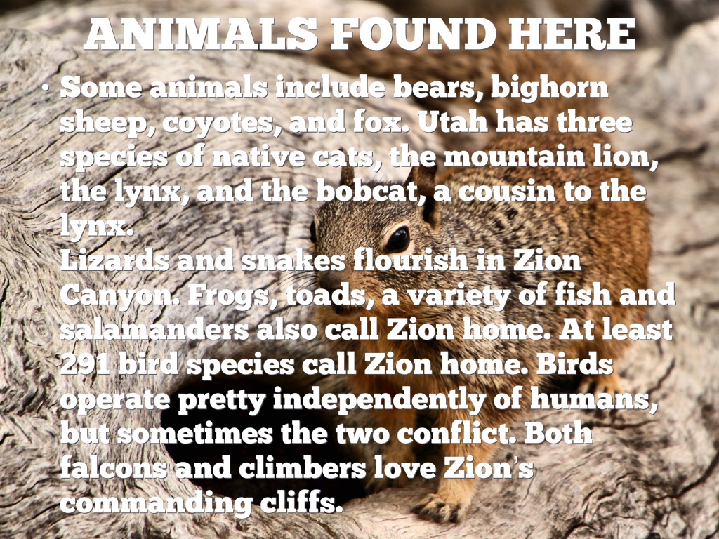 Lizards and snakes flourish in Zion Canyon. Frogs, toads, a variety of fish and salamanders also call Zion home. At least 291 bird species call Zion home. Birds operate pretty independently of humans, but sometimes the two conflict. Both falcons and climbers love Zion’s commanding cliffs.