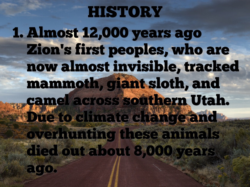 Almost 12,000 years ago Zion's first peoples, who are now almost invisible, tracked mammoth, giant sloth, and camel across southern Utah. Due to climate change and overhunting these animals died out about 8,000 years ago.