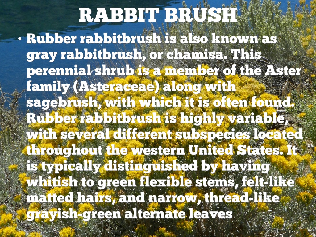 Rubber rabbitbrush is also known as gray rabbitbrush, or chamisa. This perennial shrub is a member of the Aster family (Asteraceae) along with sagebrush, with which it is often found. Rubber rabbitbrush is highly variable, with several different subspecies located throughout the western United States. It is typically distinguished by having whitish to green flexible stems, felt-like matted hairs, and narrow, thread-like grayish-green alternate leaves