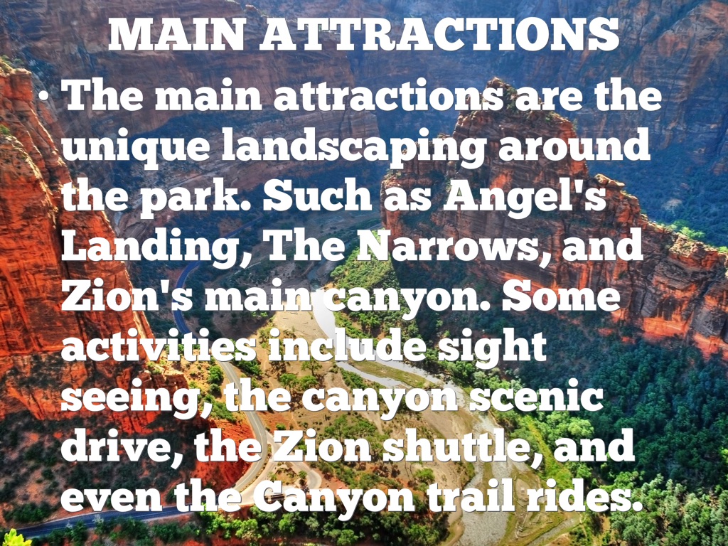 The main attractions are the unique landscaping around the park. Such as Angel's Landing, The Narrows, and Zion's main canyon. Some activities include sight seeing, the canyon scenic drive, the Zion shuttle, and even the Canyon trail rides.