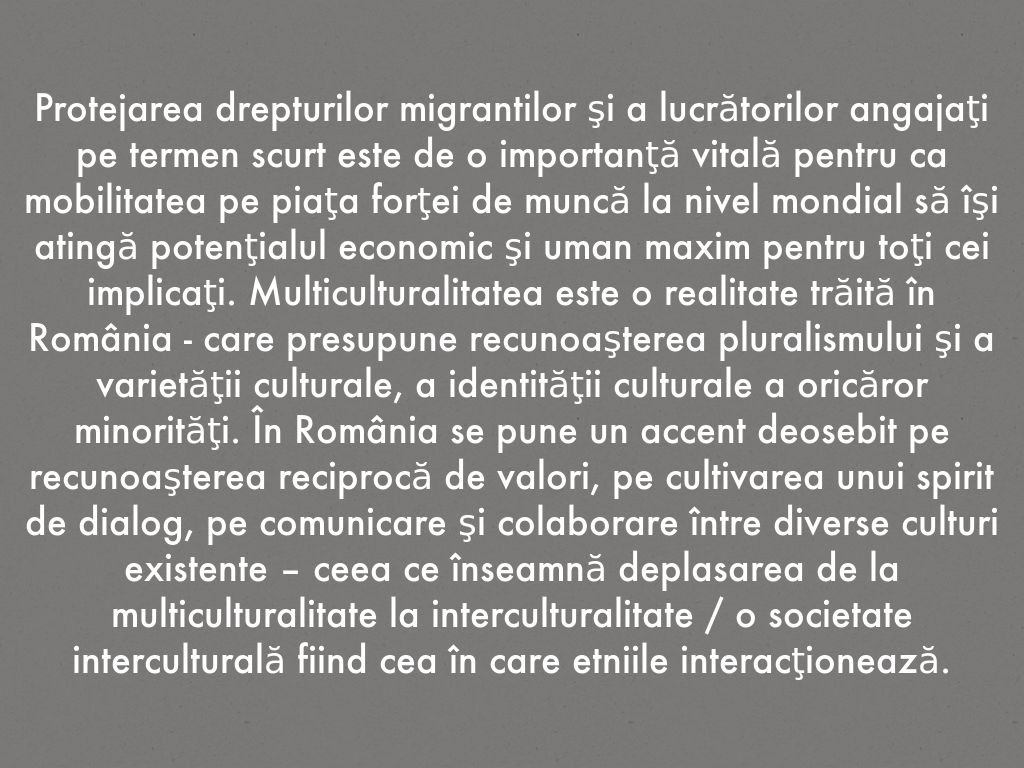 Protejarea drepturilor migrantilor şi a lucrătorilor angajaţi pe termen scurt este de o importanţă vitală pentru ca mobilitatea pe piaţa forţei de muncă la nivel mondial să îşi atingă potenţialul economic şi uman maxim pentru toţi cei implicaţi. Multiculturalitatea este o realitate trăită în România - care presupune recunoaşterea pluralismului şi a varietăţii culturale, a identităţii culturale a oricăror minorităţi. În România se pune un accent deosebit pe recunoaşterea reciprocă de valori, pe cultivarea unui spirit de dialog, pe comunicare şi colaborare între diverse culturi existente – ceea ce înseamnă deplasarea de la multiculturalitate la interculturalitate / o societate interculturală fiind cea în care etniile interacţionează.