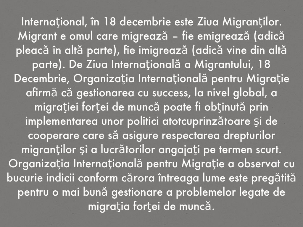 Internaţional, în 18 decembrie este Ziua Migranţilor. Migrant e omul care migrează – fie emigrează (adică pleacă în altă parte), fie imigrează (adică vine din altă parte). De Ziua Internaţională a Migrantului, 18 Decembrie, Organizaţia Internaţională pentru Migraţie afirmă că gestionarea cu success, la nivel global, a migraţiei forţei de muncă poate fi obţinută prin implementarea unor politici atotcuprinzătoare şi de cooperare care să asigure respectarea drepturilor migranţilor şi a lucrătorilor angajaţi pe termen scurt. Organizaţia Internaţională pentru Migraţie a observat cu bucurie indicii conform cărora întreaga lume este pregătită pentru o mai bună gestionare a problemelor legate de migraţia forţei de muncă.
