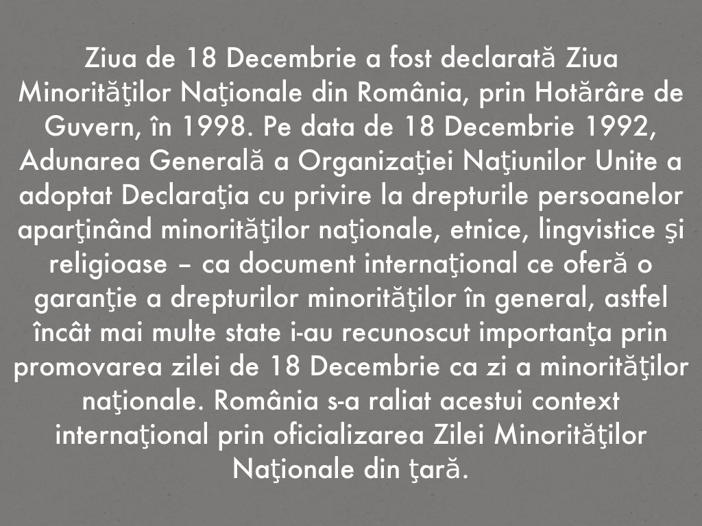 Ziua de 18 Decembrie a fost declarată Ziua Minorităţilor Naţionale din România, prin Hotărâre de Guvern, în 1998. Pe data de 18 Decembrie 1992, Adunarea Generală a Organizaţiei Naţiunilor Unite a adoptat Declaraţia cu privire la drepturile persoanelor aparţinând minorităţilor naţionale, etnice, lingvistice şi religioase – ca document internaţional ce oferă o garanţie a drepturilor minorităţilor în general, astfel încât mai multe state i-au recunoscut importanţa prin promovarea zilei de 18 Decembrie ca zi a minorităţilor naţionale. România s-a raliat acestui context internaţional prin oficializarea Zilei Minorităţilor Naţionale din ţară.