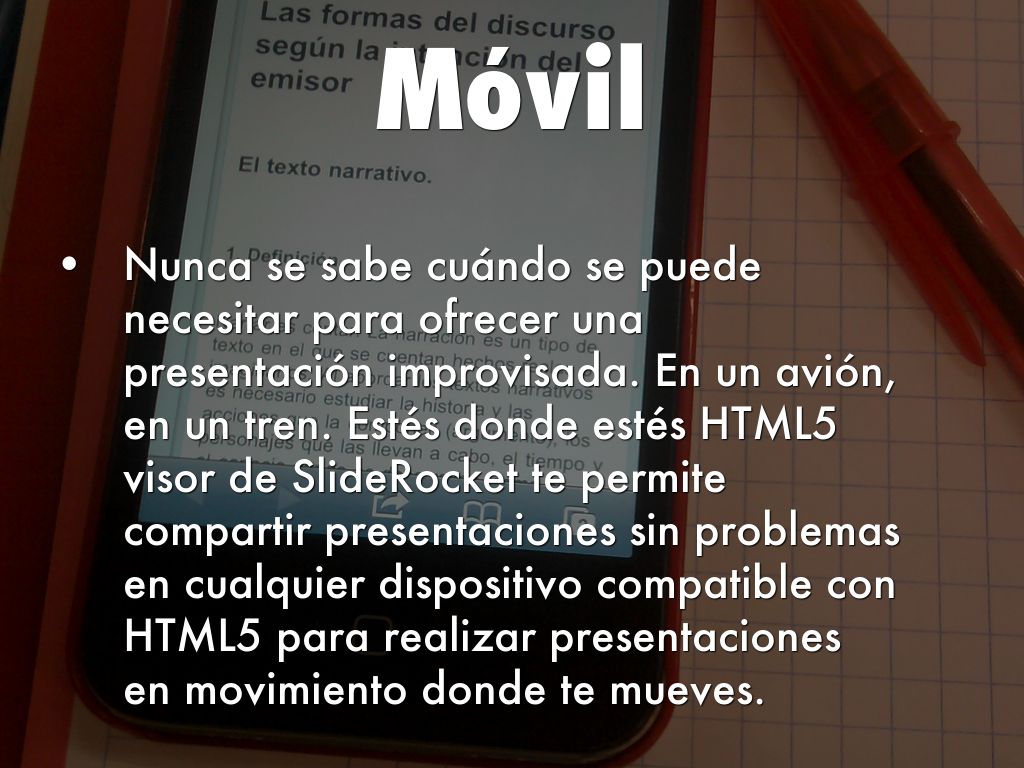 Nunca se sabe cuándo se puede necesitar para ofrecer una presentación improvisada. En un avión, en un tren. Estés donde estés HTML5 visor de SlideRocket te permite compartir presentaciones sin problemas en cualquier dispositivo compatible con HTML5 para realizar presentaciones en movimiento donde te mueves.