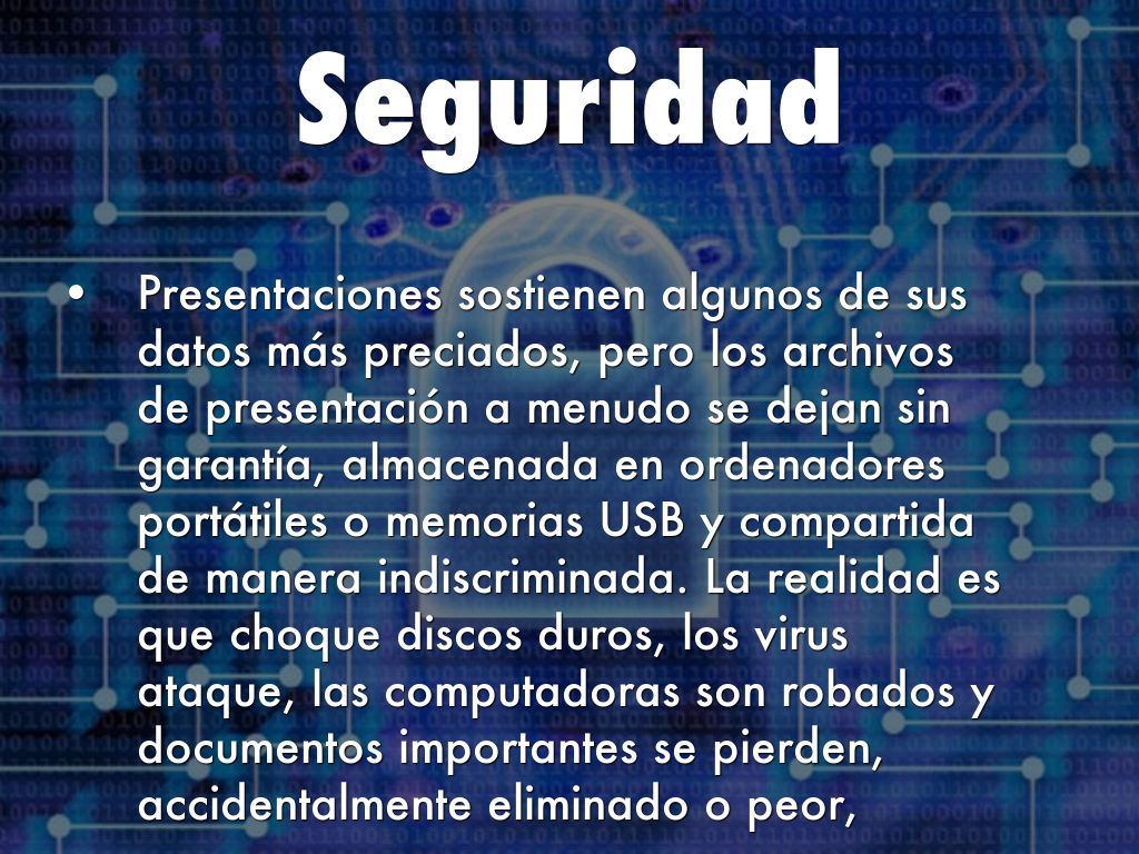 Presentaciones sostienen algunos de sus datos más preciados, pero los archivos de presentación a menudo se dejan sin garantía, almacenada en ordenadores portátiles o memorias USB y compartida de manera indiscriminada. La realidad es que choque discos duros, los virus ataque, las computadoras son robados y documentos importantes se pierden, accidentalmente eliminado o peor, compartida con los competidores.