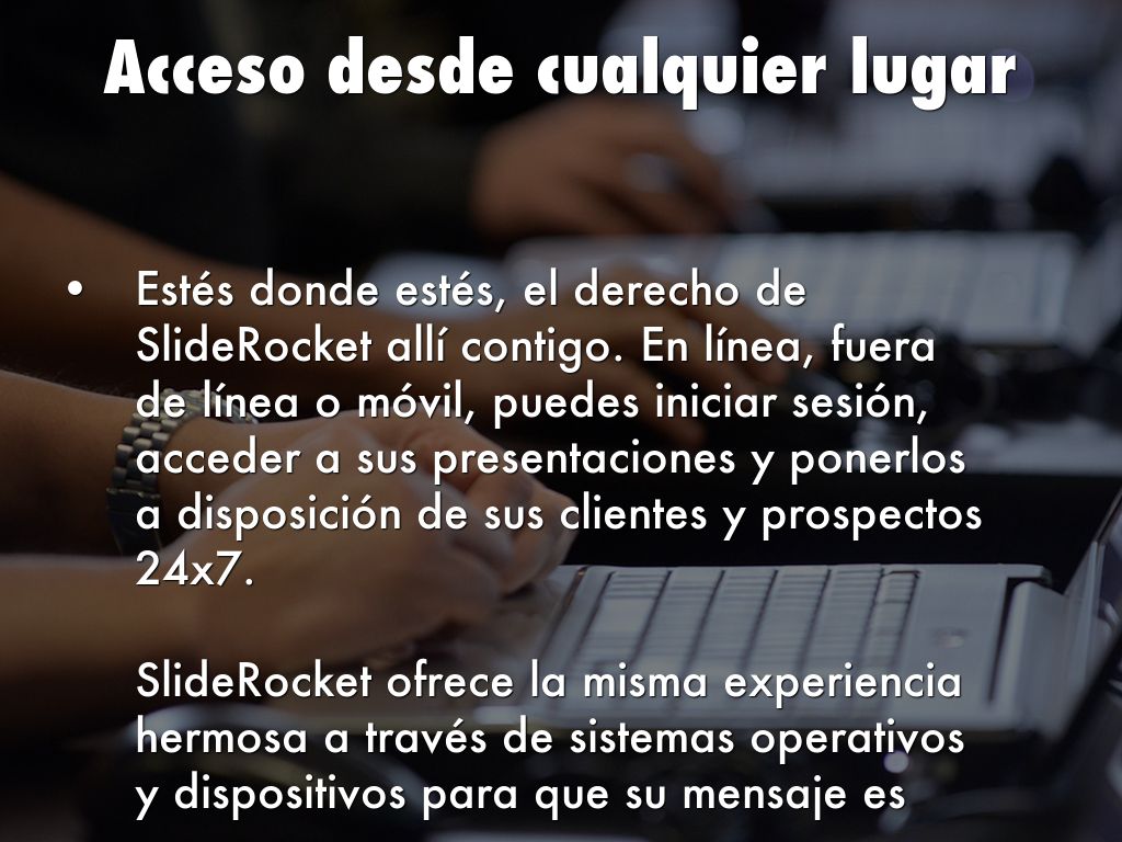 Estés donde estés, el derecho de SlideRocket allí contigo. En línea, fuera de línea o móvil, puedes iniciar sesión, acceder a sus presentaciones y ponerlos a disposición de sus clientes y prospectos 24x7.
