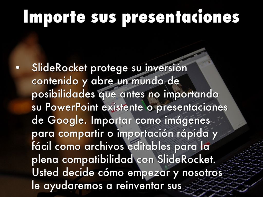SlideRocket protege su inversión contenido y abre un mundo de posibilidades que antes no importando su PowerPoint existente o presentaciones de Google. Importar como imágenes para compartir o importación rápida y fácil como archivos editables para la plena compatibilidad con SlideRocket.