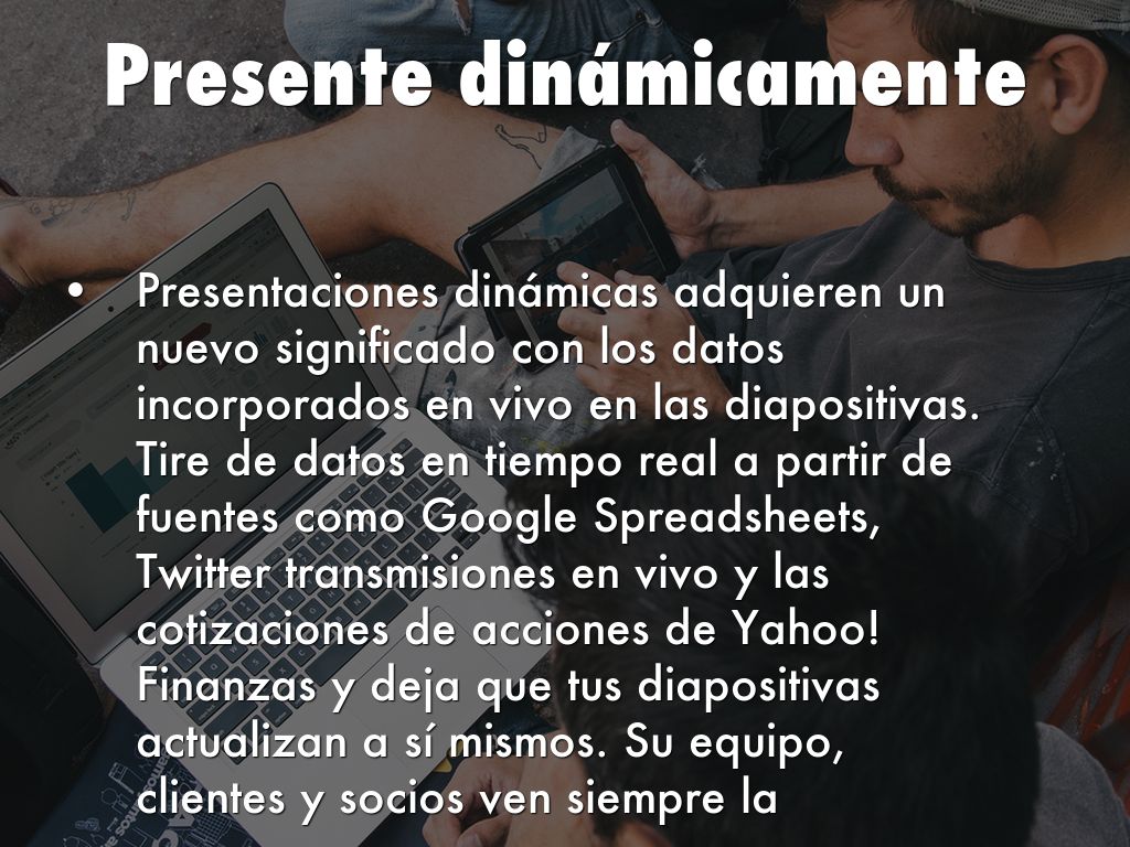 Presentaciones dinámicas adquieren un nuevo significado con los datos incorporados en vivo en las diapositivas. Tire de datos en tiempo real a partir de fuentes como Google Spreadsheets, Twitter transmisiones en vivo y las cotizaciones de acciones de Yahoo! Finanzas y deja que tus diapositivas actualizan a sí mismos. Su equipo, clientes y socios ven siempre la información más reciente, directamente de la fuente.