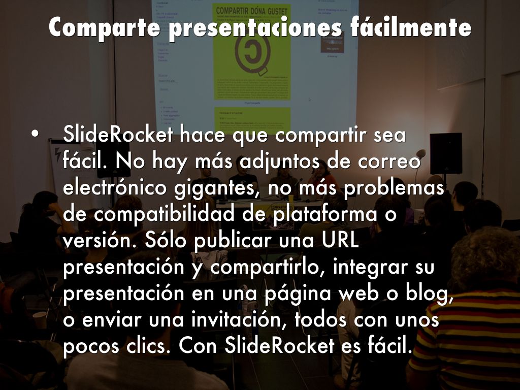 SlideRocket hace que compartir sea fácil. No hay más adjuntos de correo electrónico gigantes, no más problemas de compatibilidad de plataforma o versión. Sólo publicar una URL presentación y compartirlo, integrar su presentación en una página web o blog, o enviar una invitación, todos con unos pocos clics. Con SlideRocket es fácil.