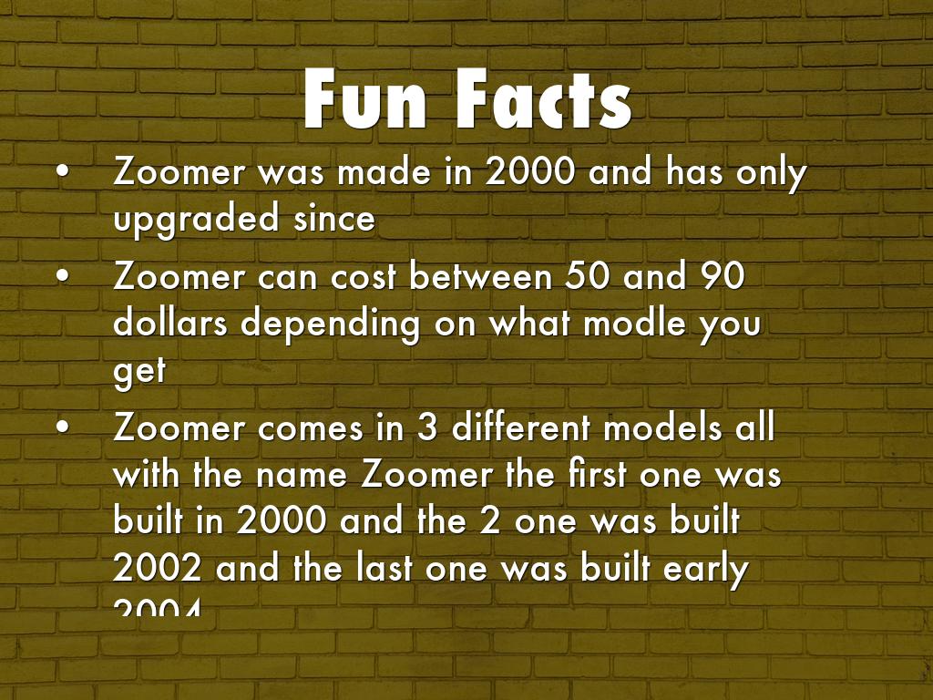 • Zoomer comes in 3 different models all with the name Zoomer the first one was built in 2000 and the 2 one was built 2002 and the last one was built early 2004