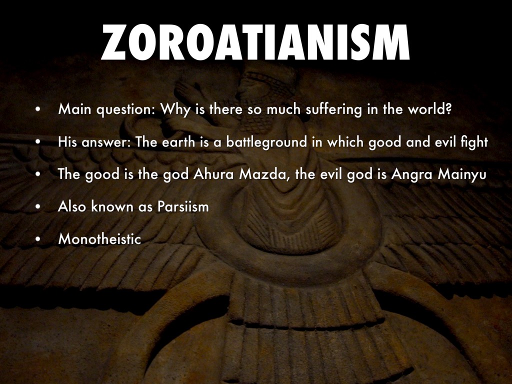 • The good is the god Ahura Mazda, the evil god is Angra Mainyu
