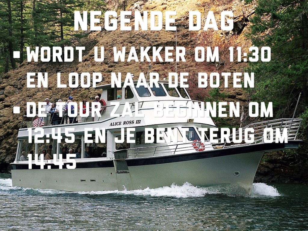 • de tour zal beginnen om 12:45 en je bent terug om 14:45