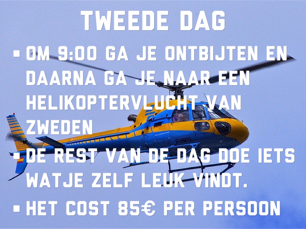 • om 9:00 ga je ontbijten en daarna ga je naar een helikoptervlucht van zweden