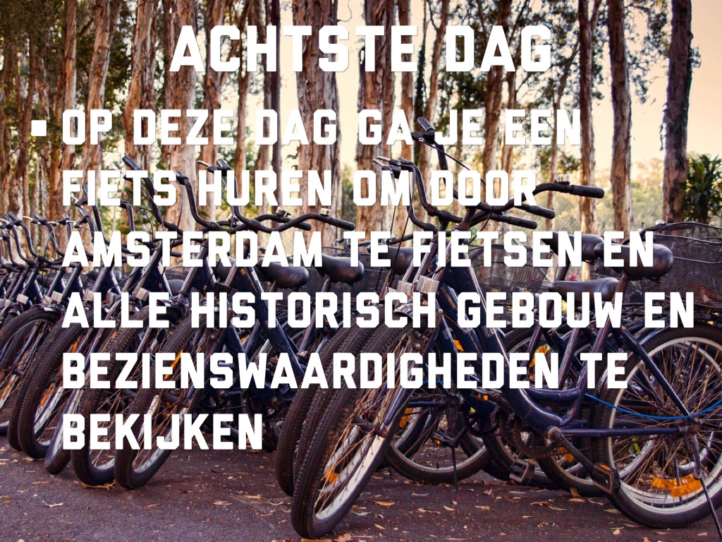 • op deze dag ga je een fiets huren om door Amsterdam te fietsen en alle historisch gebouw en bezienswaardigheDen te bekijken