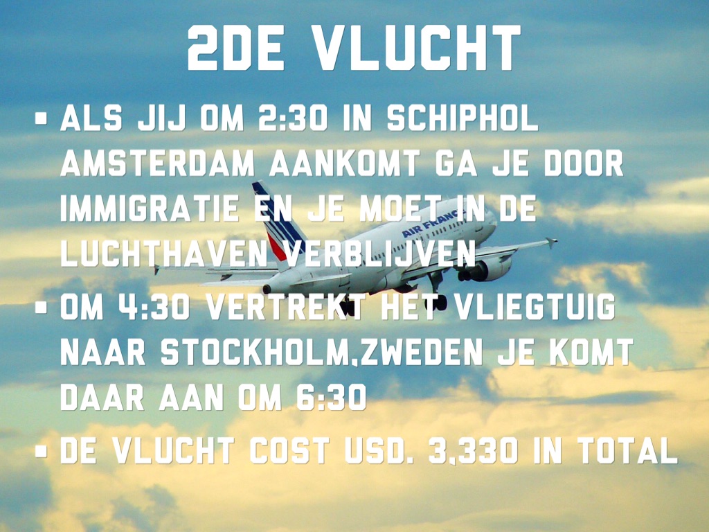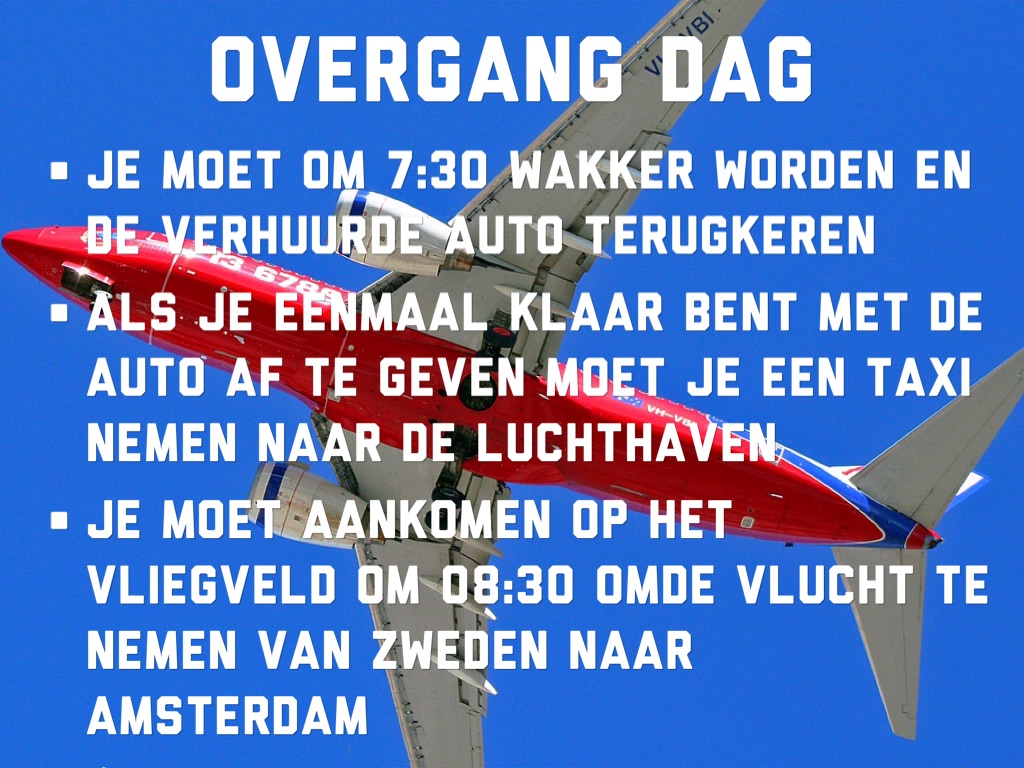 • je moet aankomen op het vliegveld om 08:30 omde vlucht te nemen van Zweden naar Amsterdam