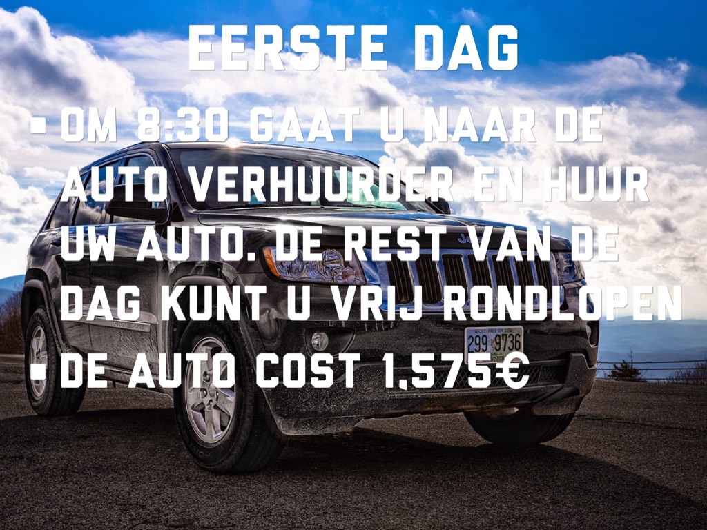 • om 8:30 gaat u naar de auto verhuurder en huur uw auto. de rest van de dag kunt u vrij rondlopen