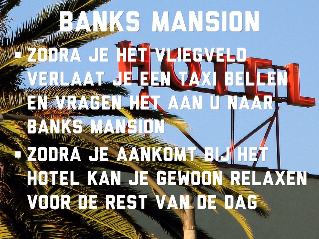 • zodra je het vliegveld verlaat je een taxi bellen en vragen het aan u naar Banks Mansion